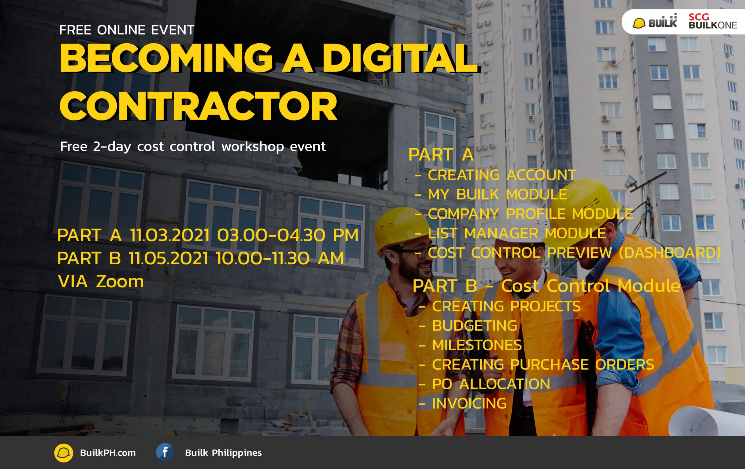 is a free online workshop for the contractor to manage their construction business cost with new technology – BUILK  is a 100% all-time FREE software that we designed for SMEs contractor. We believed that with BUILK, Our goal is to revolutionize the construction industry in the Philippines by increasing work efficiency and reduce the risk of doing business By bringing knowledge of new technologies and creative ideas for the construction industry.