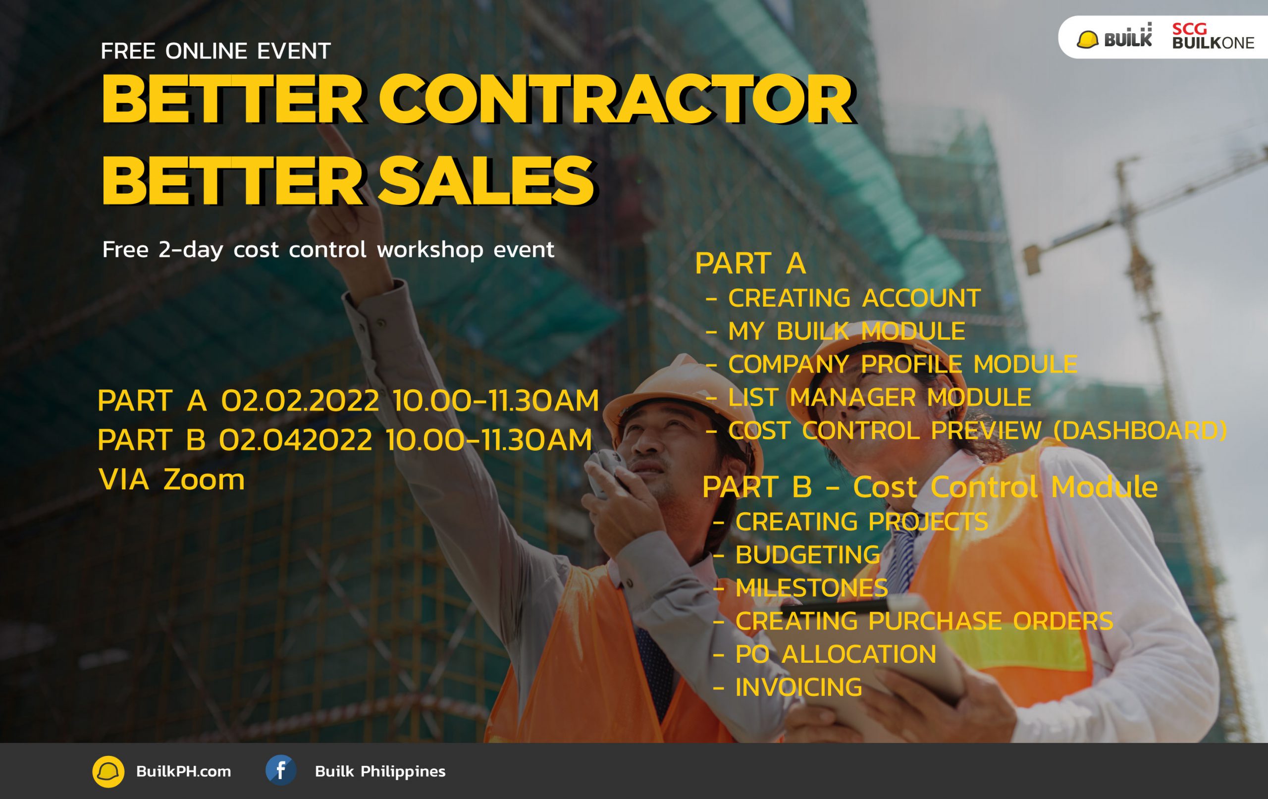 is a free online workshop for the contractor to manage their construction business cost with new technology – BUILK is a 100% all-time FREE software that we designed for SMEs contractor. We believed that with BUILK, Our goal is to revolutionize the construction industry in the Philippines by increasing work efficiency and reduce the risk of doing business By bringing knowledge of new technologies and creative ideas for the construction industry.