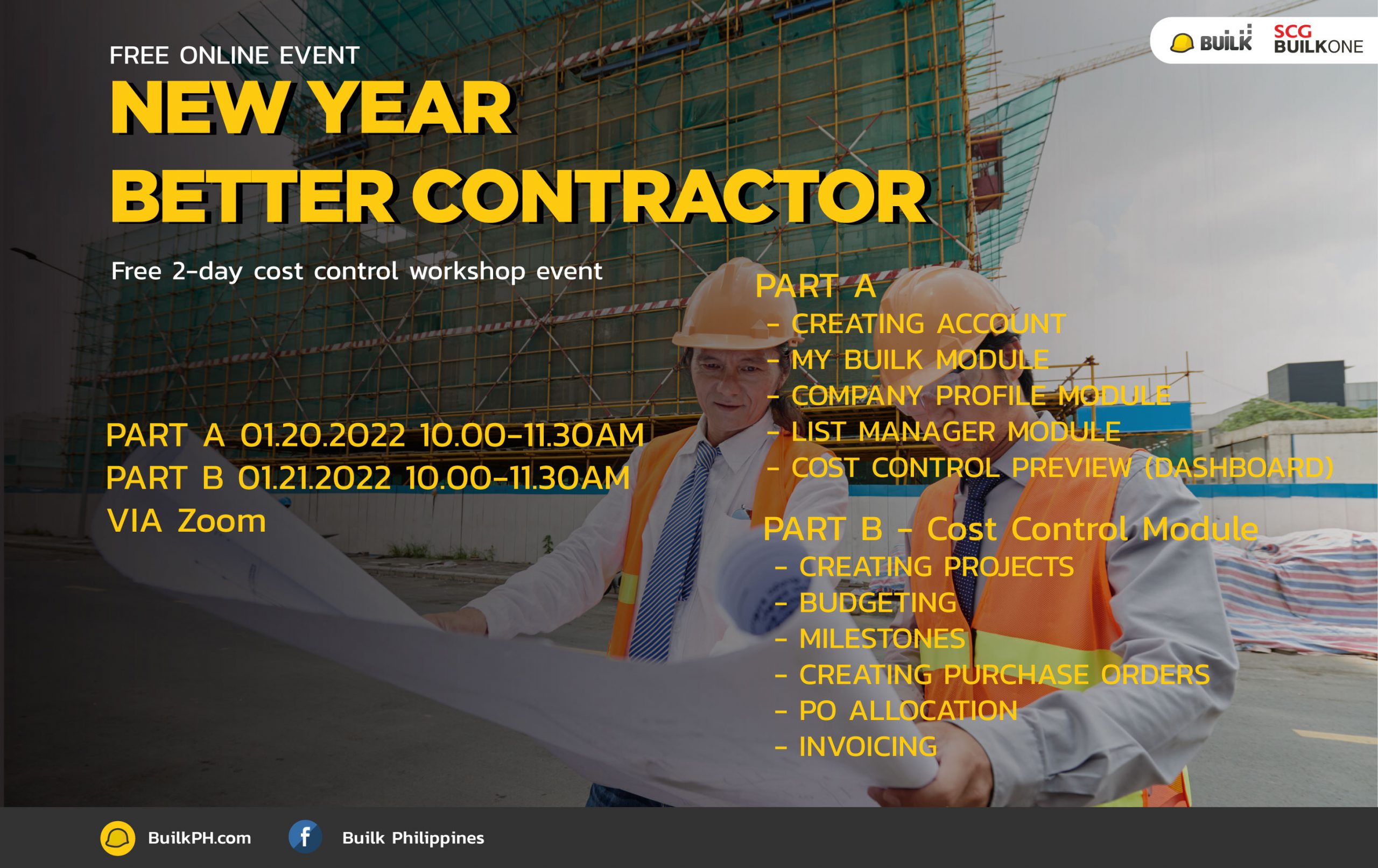 is a free online workshop for the contractor to manage their construction business cost with new technology – BUILK is a 100% all-time FREE software that we designed for SMEs contractor. We believed that with BUILK, Our goal is to revolutionize the construction industry in the Philippines by increasing work efficiency and reduce the risk of doing business By bringing knowledge of new technologies and creative ideas for the construction industry.